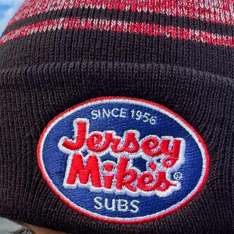 Three contrast stripes give a retro nod to this pom beanie, while the marled yarns put it right on-trend. Embroidered Jersey Mike’s logo and tonal embroidered New Era flag.