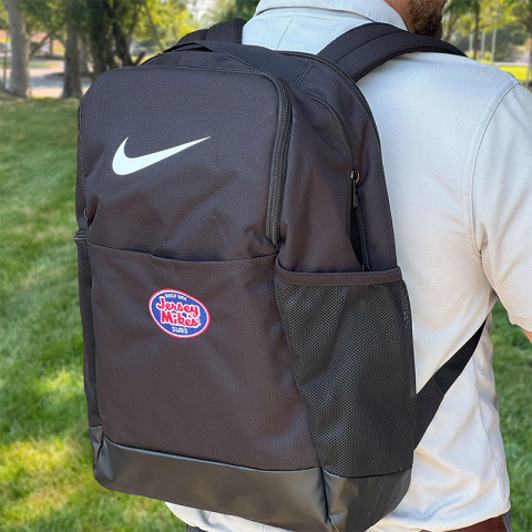 This versatile backpack is ideal for packing everything you need to get you through a busy training day or when you’re away from your locker, gym or home. 100% recycled polyester dobby Back panel and shoulder straps are padded for comfortable carrying. Multiple pockets provide organized small-item storage Zippered main compartment offers spacious and secure storage. Plush-lined, zippered pocket for headphones or electronics. Padded sleeve safely stores a laptop. A water-resistant coating on bottom panel helps keep gear dry. Contrast Swoosh design trademark. Laptop sleeve fits most 15′ laptops Dimensions: 18’h x 12’w x 7’d.